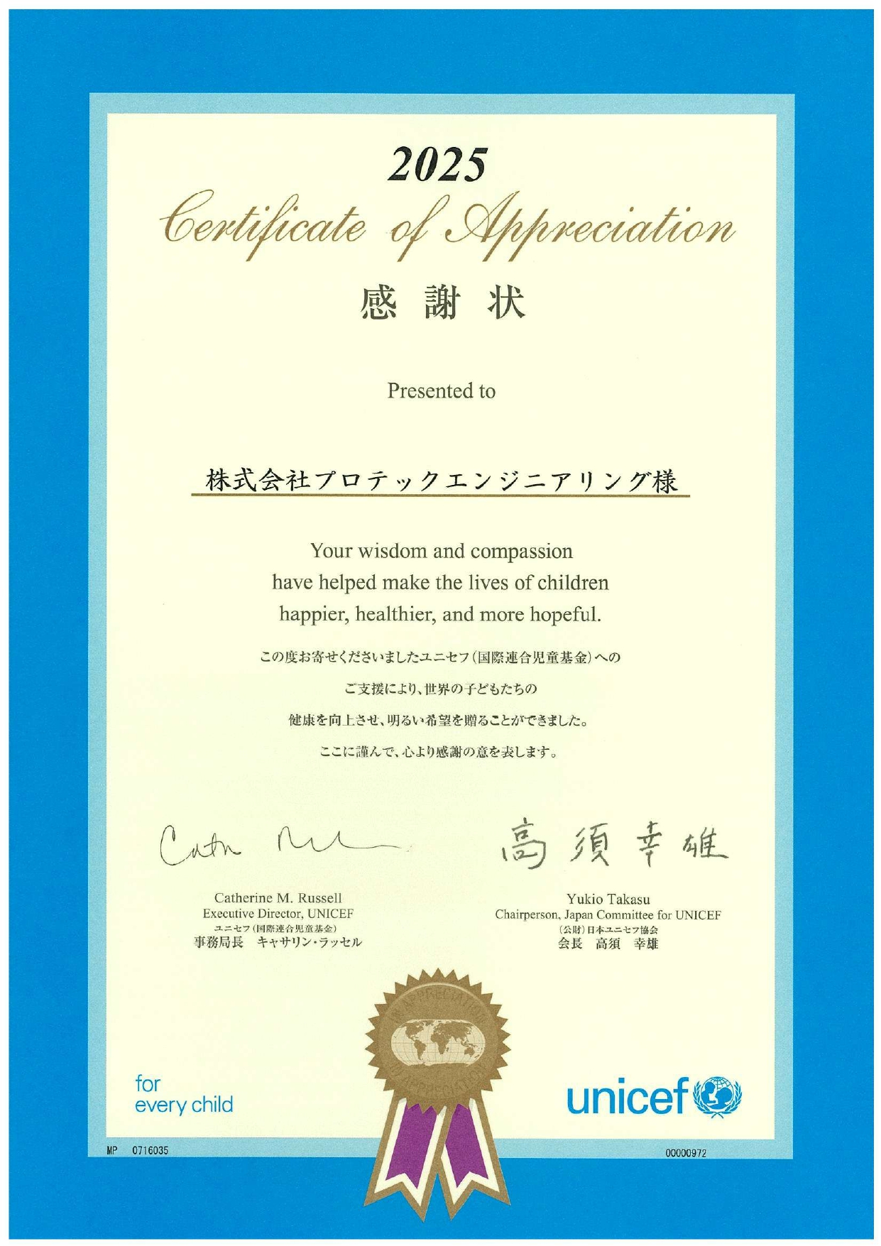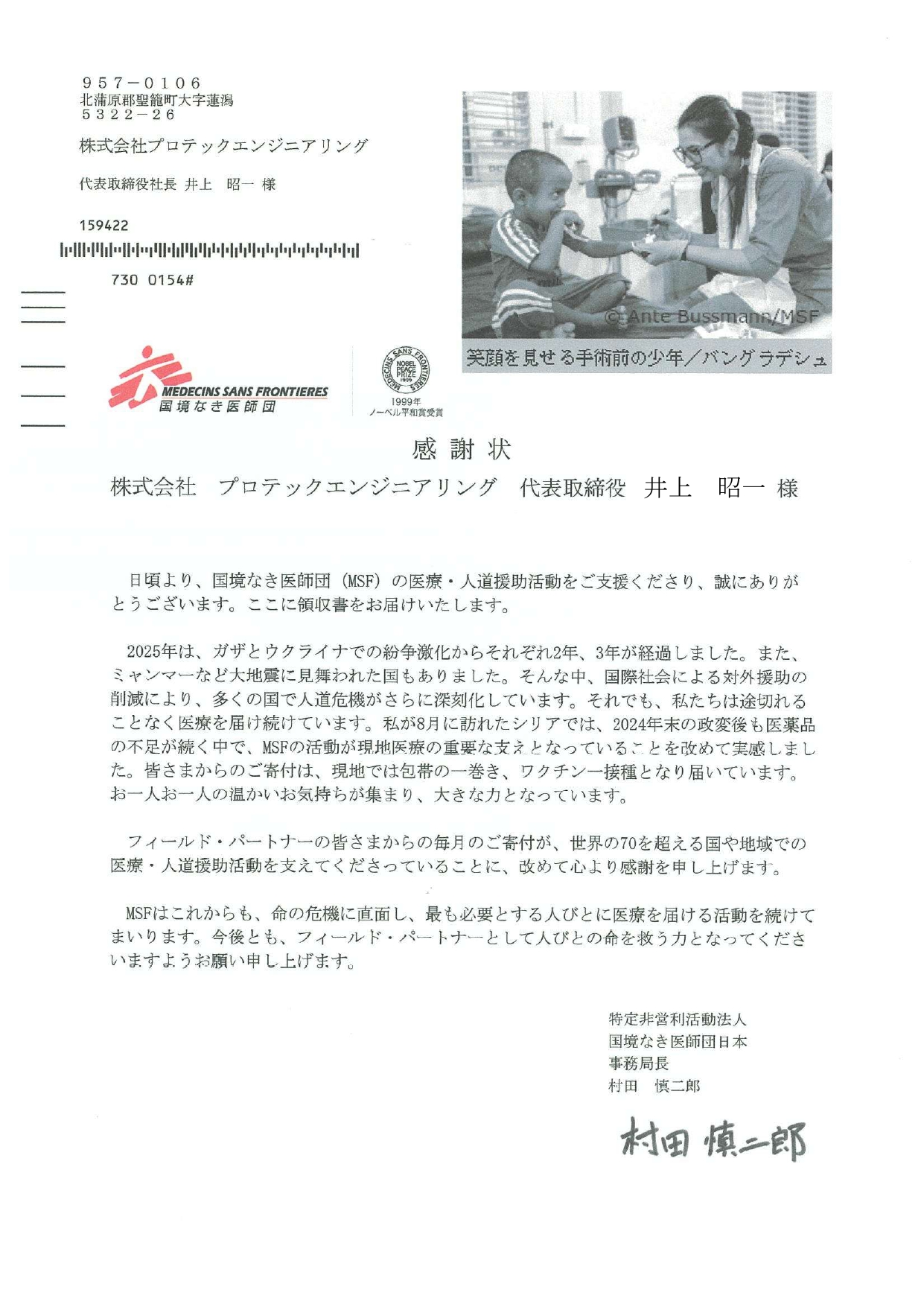 > 日本ユニセフ協会・国境なき医師団 感謝状