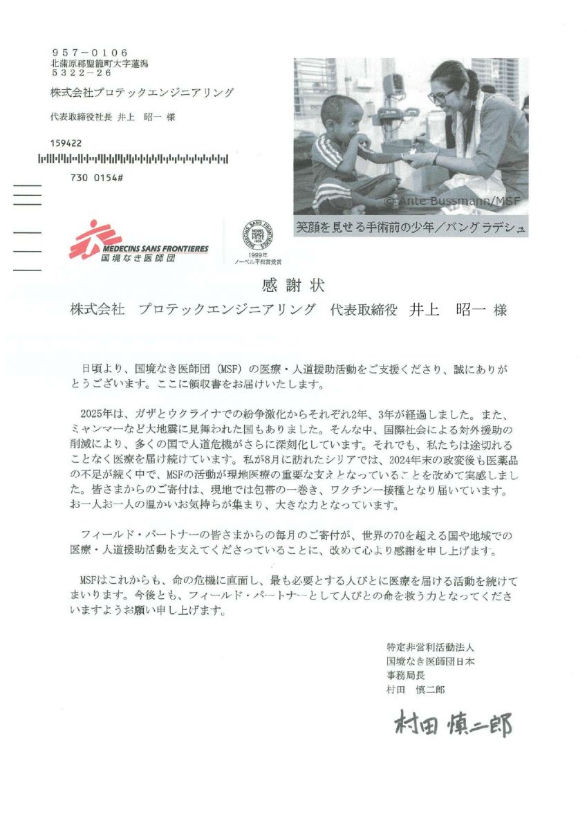日本ユニセフ協会・国境なき医師団より、今年も感謝状をいただきました。