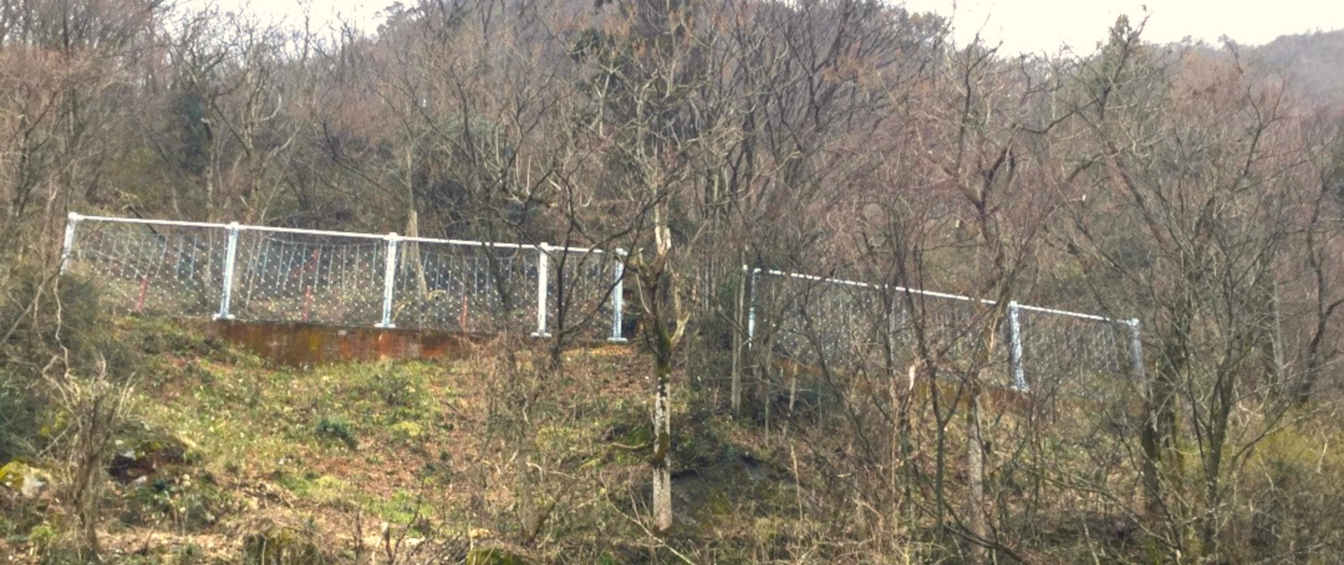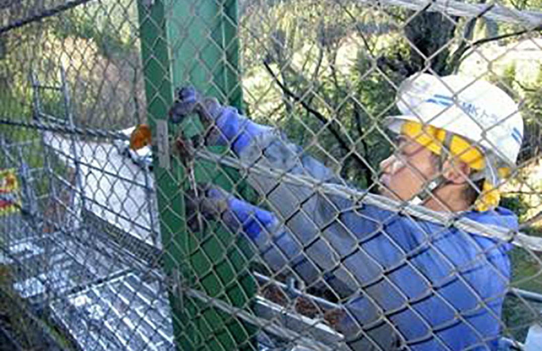 既設柵のワイヤロープを外し、再強フェンスの支柱を建て込めるようにします。 -