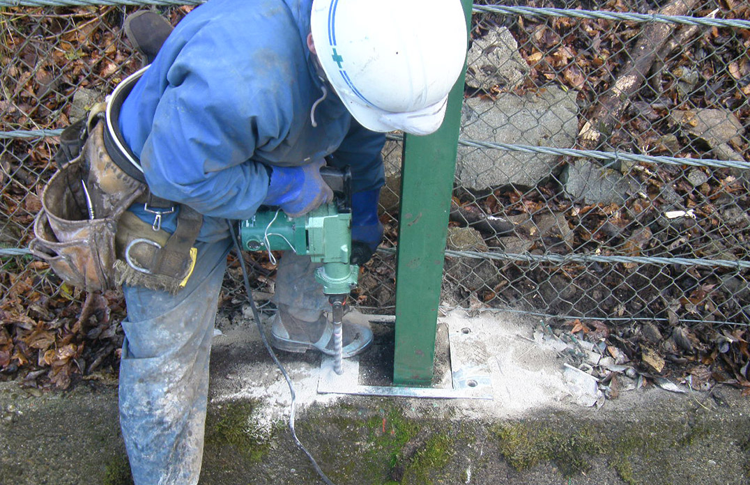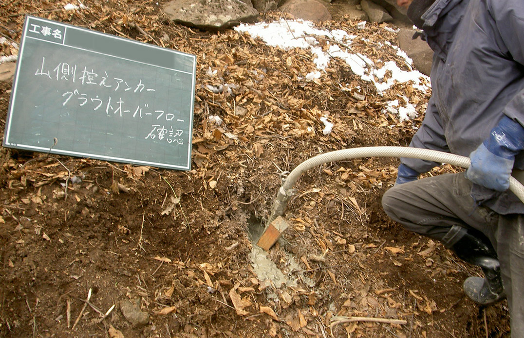 各アンカーの打設位置に、削岩機を用いて所定の角度で削孔し、アンカー体を挿入します。 -
