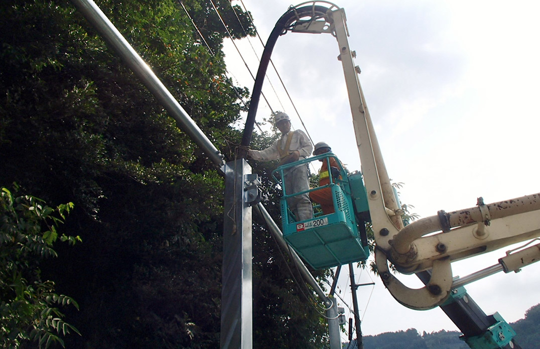 再強フェンスの支柱内部にモルタルを充填し、既設柵の支柱と一体化させます。 -