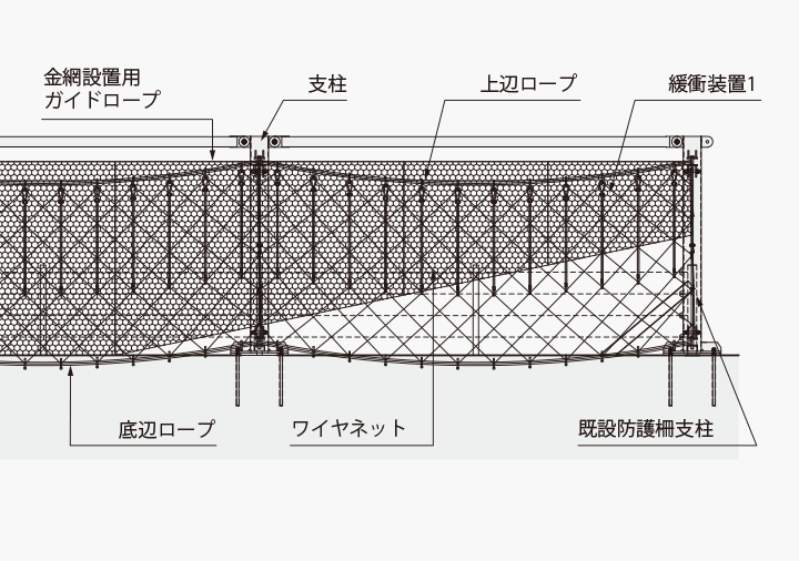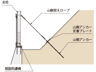 再強フェンスは、補強支柱、金網、ワイヤネット、ワイヤロープ、緩衝金具で構成されています。基礎はアンカー構造であり、山側にはアンカーロッドを、支柱基部にはアンカーボルトを用います。