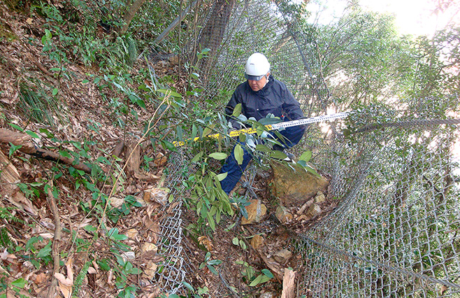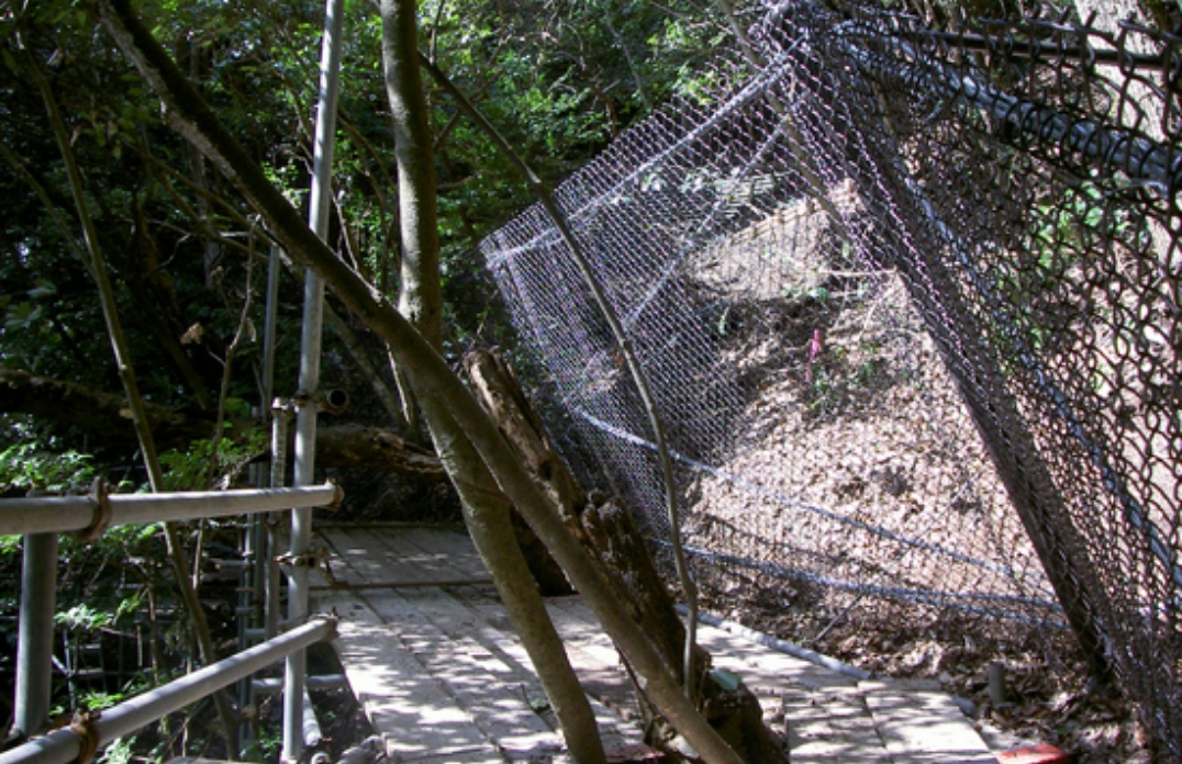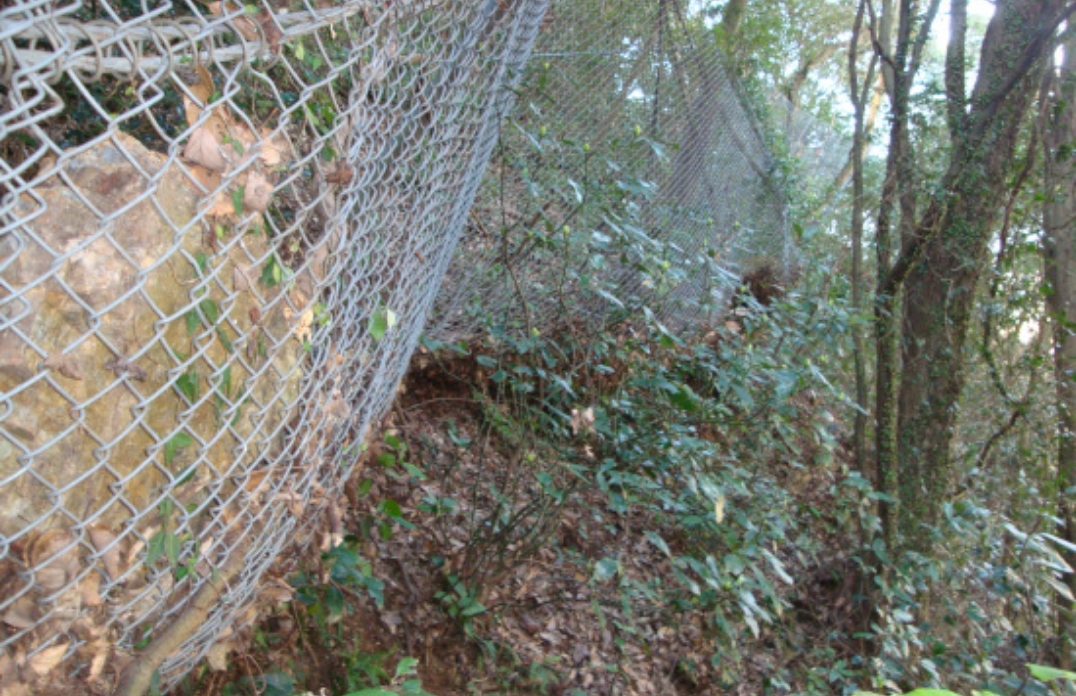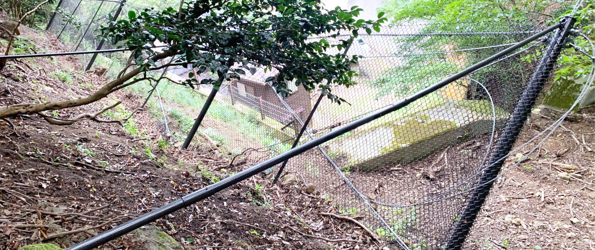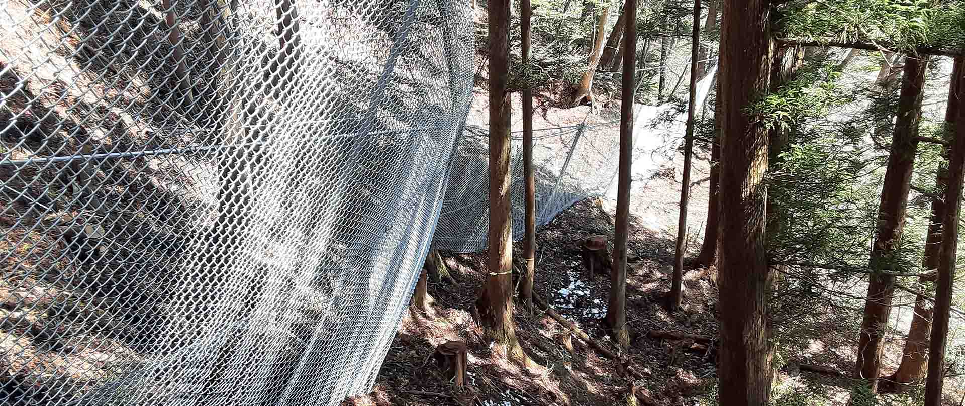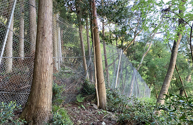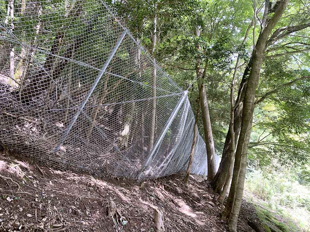 アンカーで地山に係留させる構造のため、大掛かりな基礎が不要です。立木の伐採や地山の掘削、廃土の発生を最小限に抑えることができ、環境への負荷を低減します。また、主にネット部材で構成されているため透過性に優れ、周囲の景観に調和します。