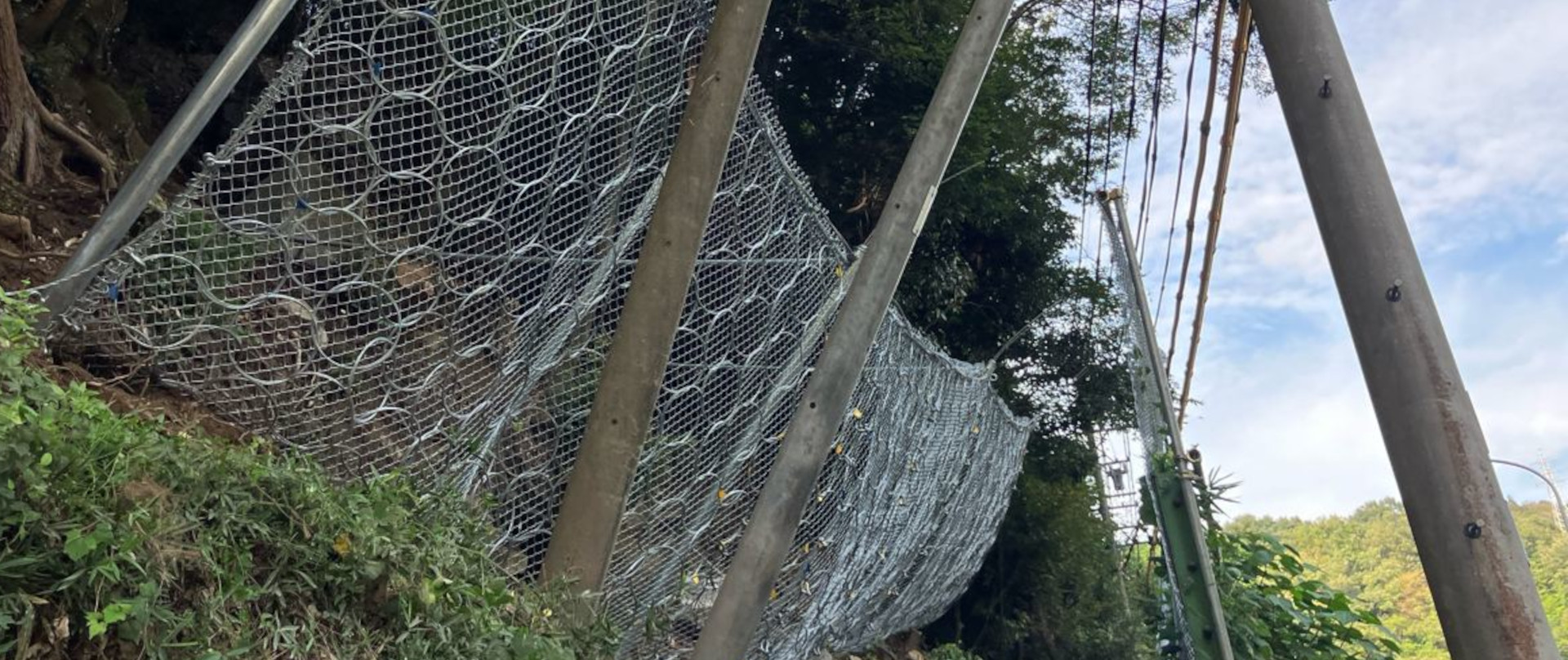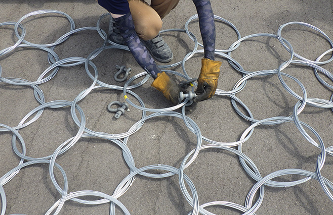 支柱谷側に金網を設置します。金網は結合コイルでワイヤロープと結合します。