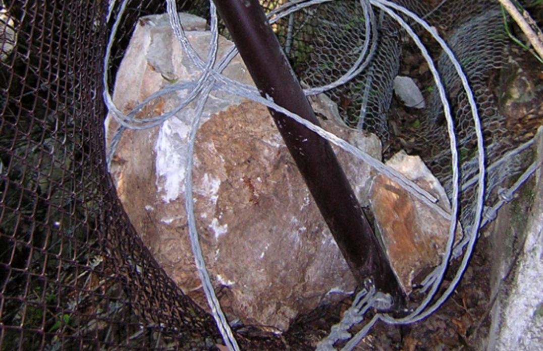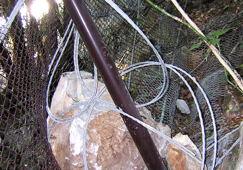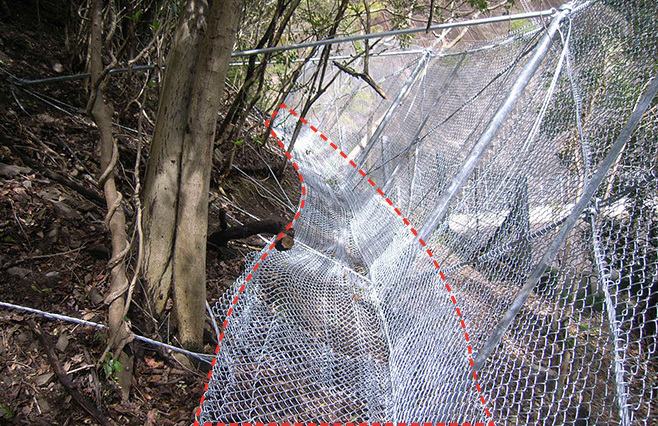 推定落石エネルギー120kJの落石をしっかりと捕捉し、容易に復旧することができました。時期 2003年 場所 秋芳洞入口(山口県美祢市) 状況 落石の捕捉 対応 変形した山側控え支柱パイプの交換、