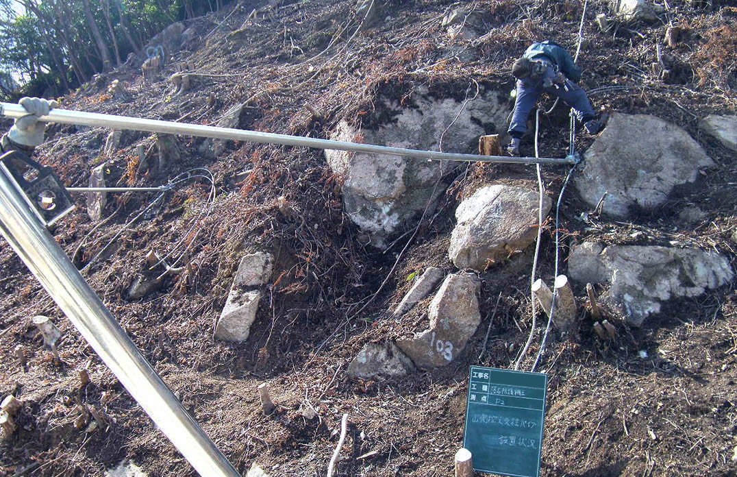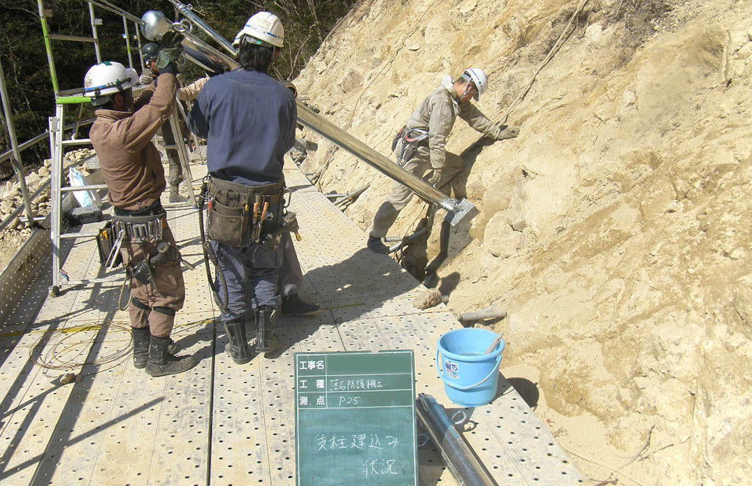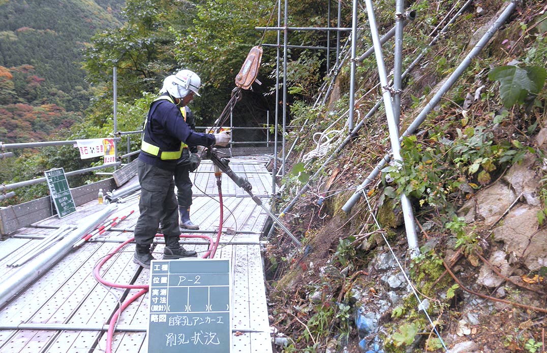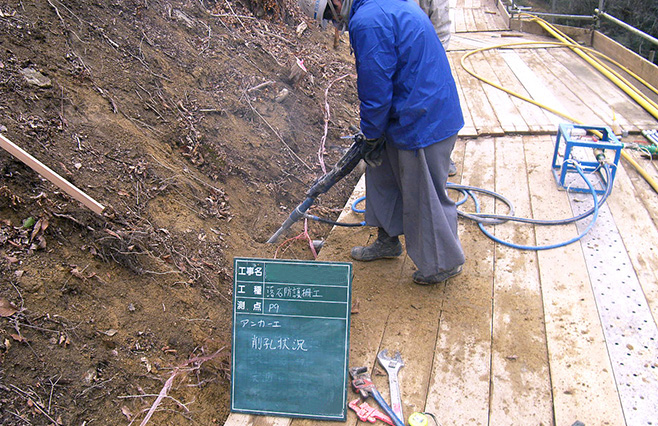 各アンカーの打設位置に、削岩機を用いて所定の角度で削孔し、アンカー体を挿入します。 -