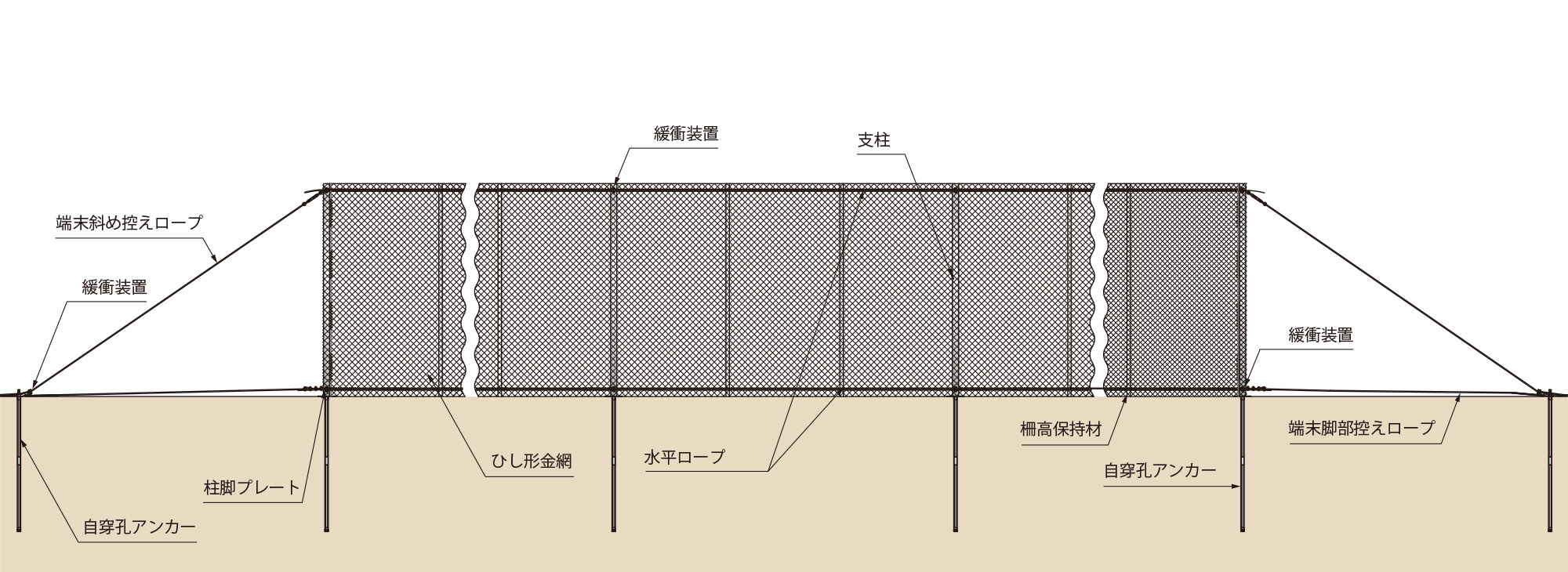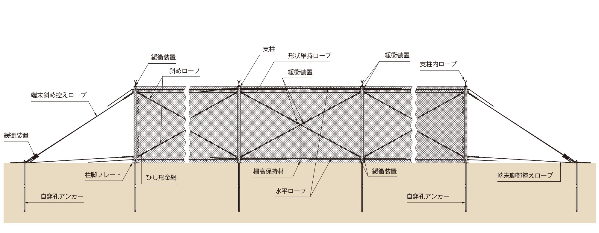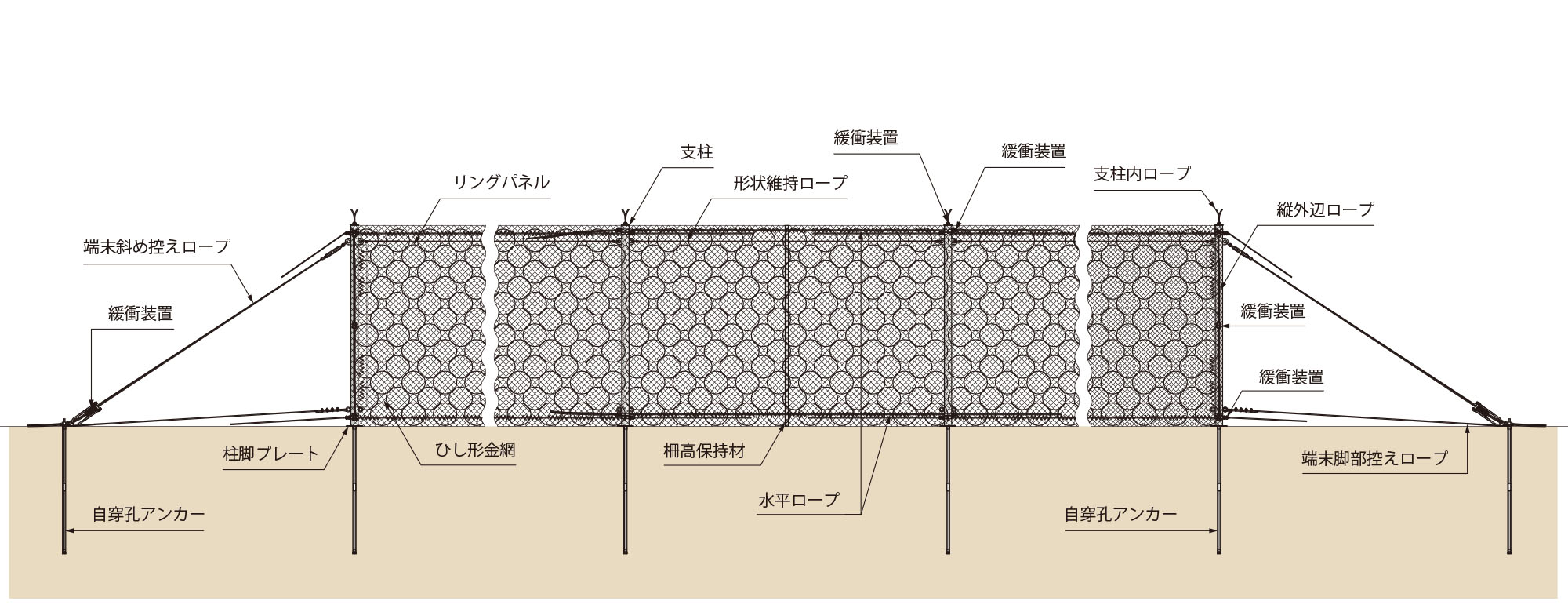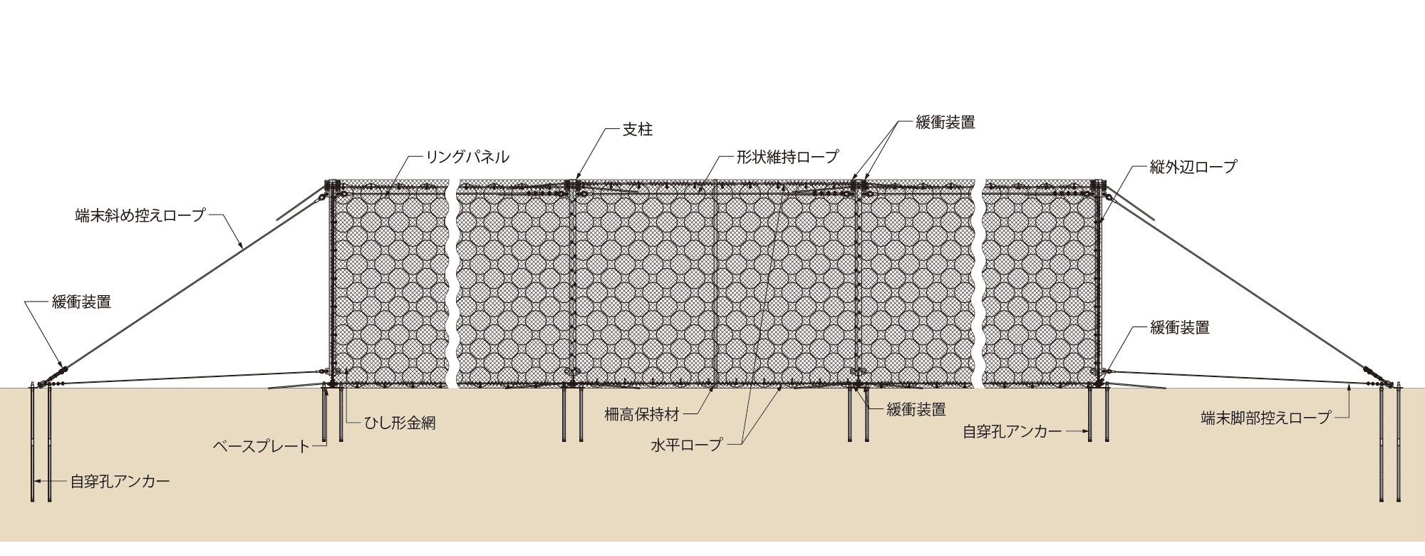 ※ARC300/ARC500/ARC1000の場合、支柱谷側にリングパネルをシャックルでワイヤロープと接続します。その後、金網は支柱とパネルの間に広げ、結合コイルでワイヤロープと結合します。 -