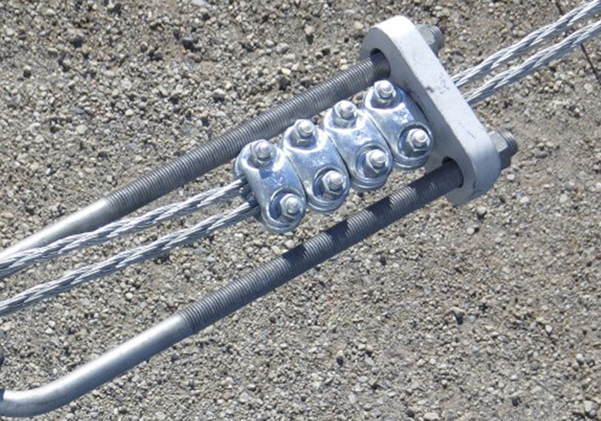 支柱頭部と基部から、端部と山側に控えロープを設置します。ロープを緊張させてアンカー位置で定着します。 -
