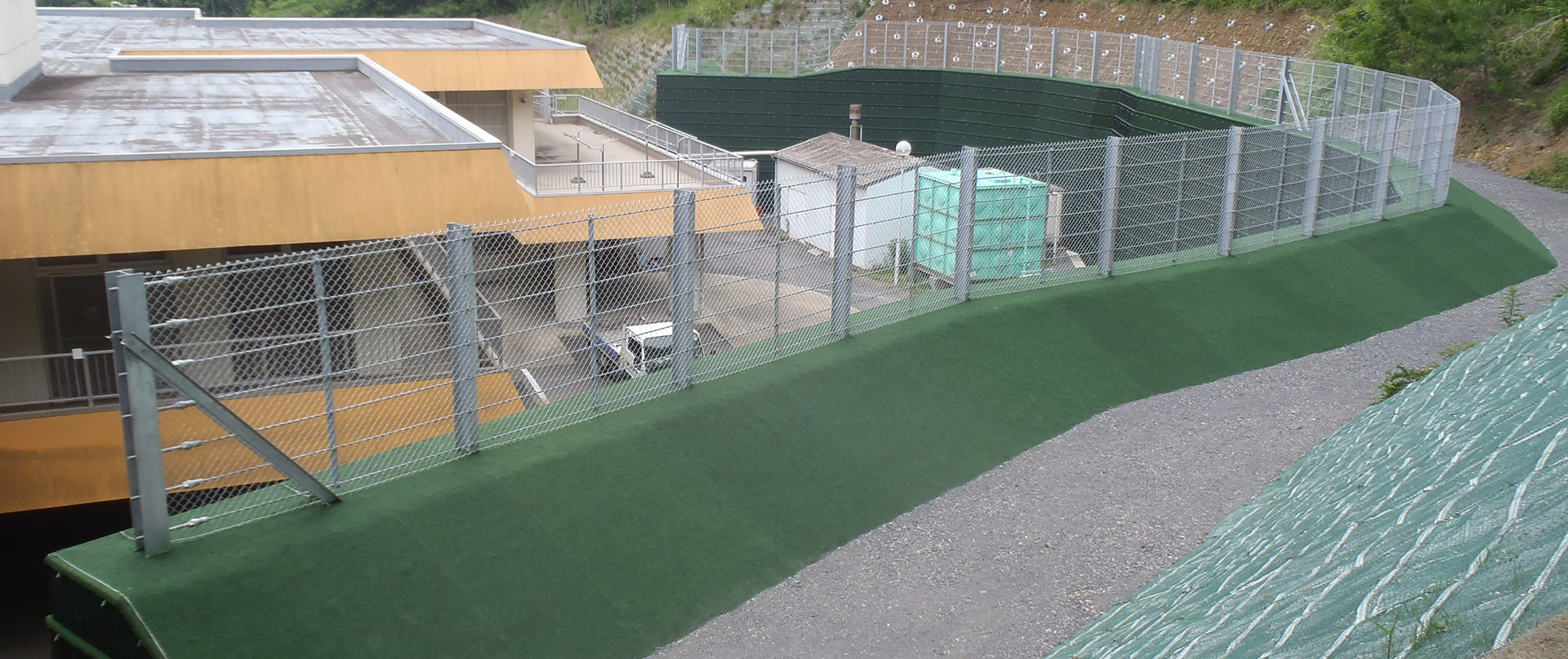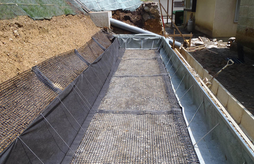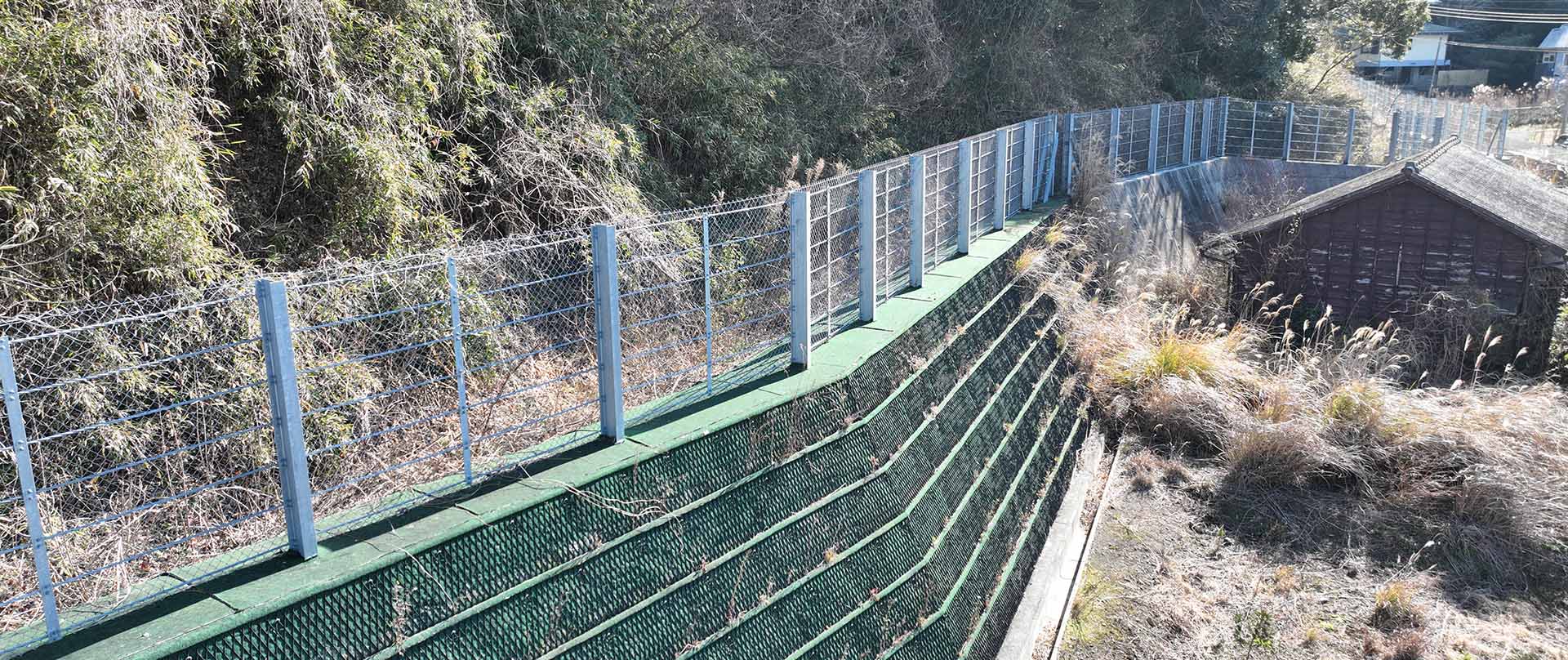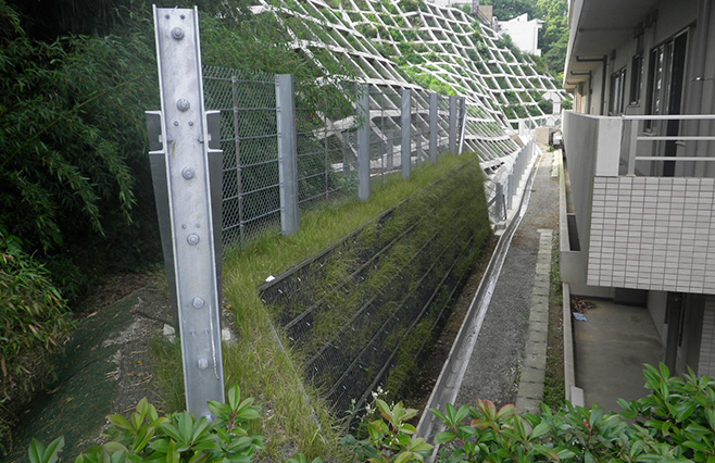 堤体は地山にもたれた形状であり、民家裏の急傾斜地など、設置スペースが限られた現場や急峻な地形にも対応可能です。