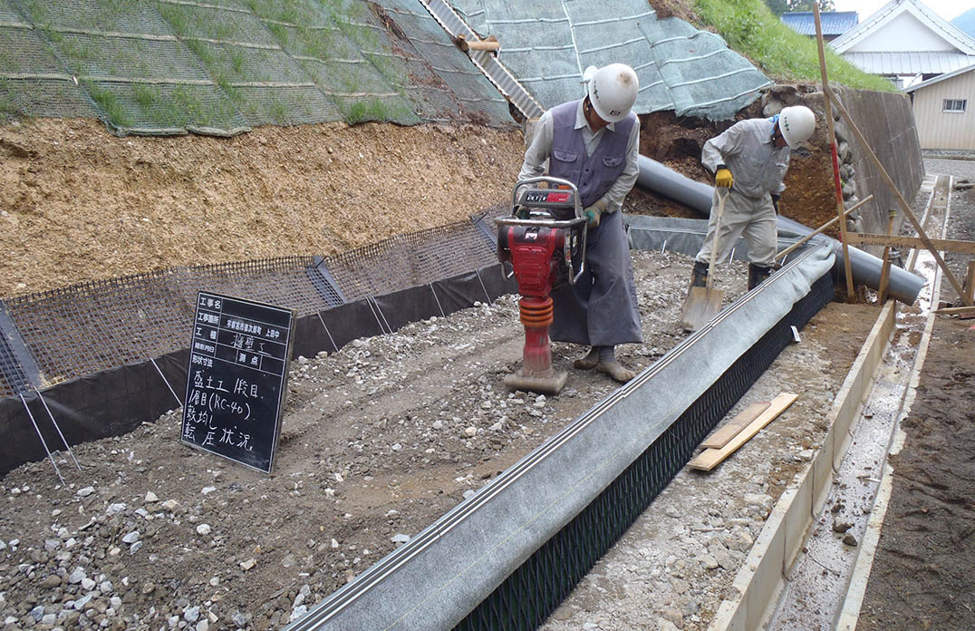 盛土材を撒き出し、転圧して締め固めます。ジオグリッドは、次の段のジオグリッドと連結します。 -