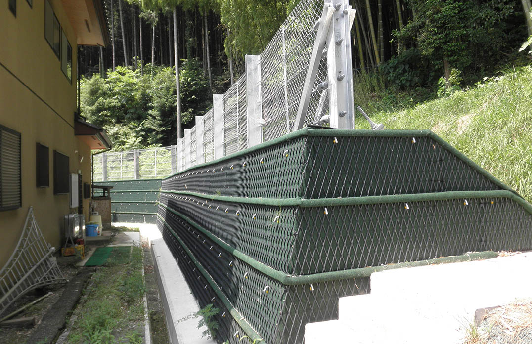 鋼管に支柱を建て込み、ロープ、金網を取り付けて防護柵を構築します。 -