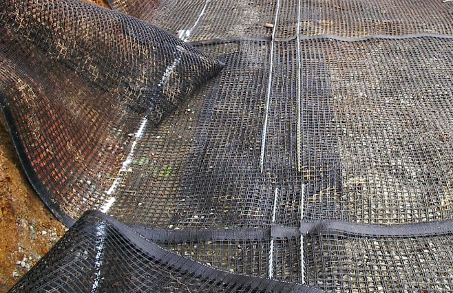 構造を支える繊維材です。伸び強度の異なる繊維を織り込むことにより、粘り(靭性)を発揮し、衝撃に対応します。土とジオグリッドを組み合わせて、補強土壁部の抵抗体を構築します。