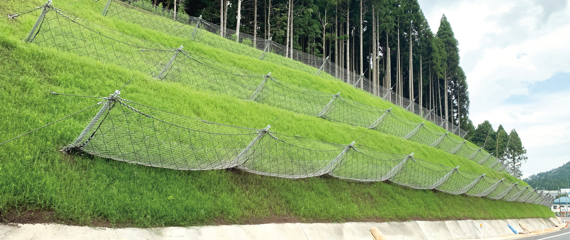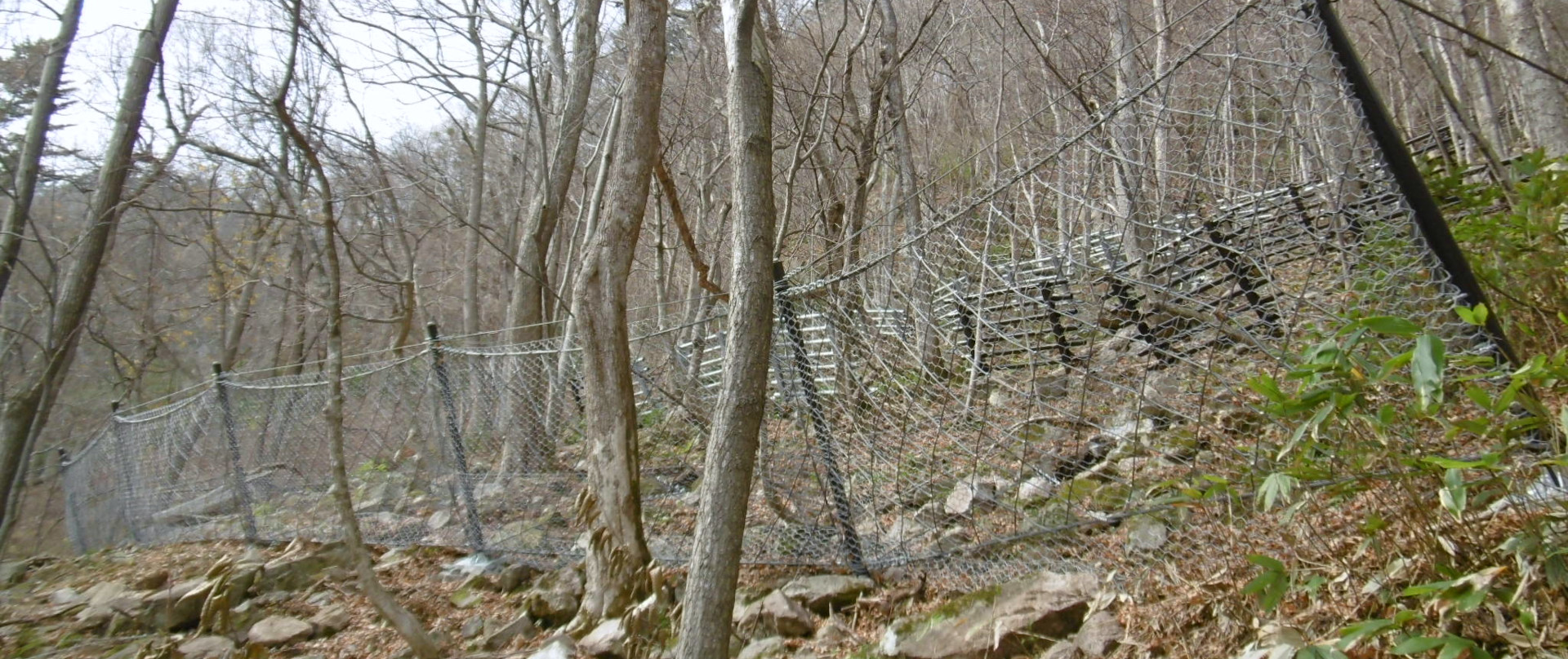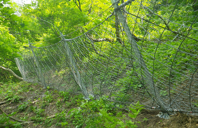 基礎がアンカー構造のため、設置の際大きく地山を掘削する必要がなく、環境への負荷を低減します。立木を避けて配置することが可能なため、伐採を最小限に抑えることができます。また、主にネット部材で構成されるため透過性に優れ、周囲の景観に調和します。