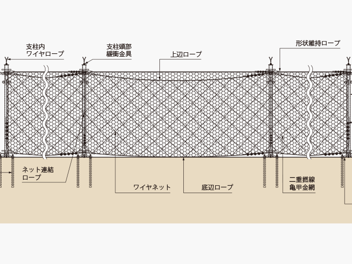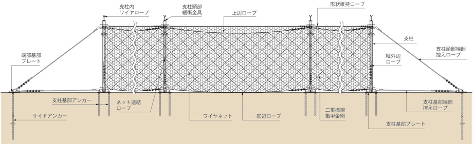 ワイヤネットの上辺・底辺にワイヤロープを通し、支柱間にネットを設置します。 -