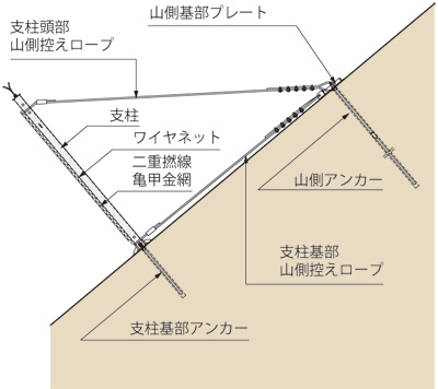 支柱頭部と基部から、端部と山側に控えロープを設置します。ロープを緊張させてアンカー位置で定着します。 -