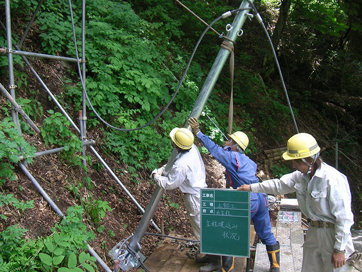 ベースプレートを設置し、支柱を建て込みます。支柱内ワイヤロープを緊張させ、支柱を自立させます。 -