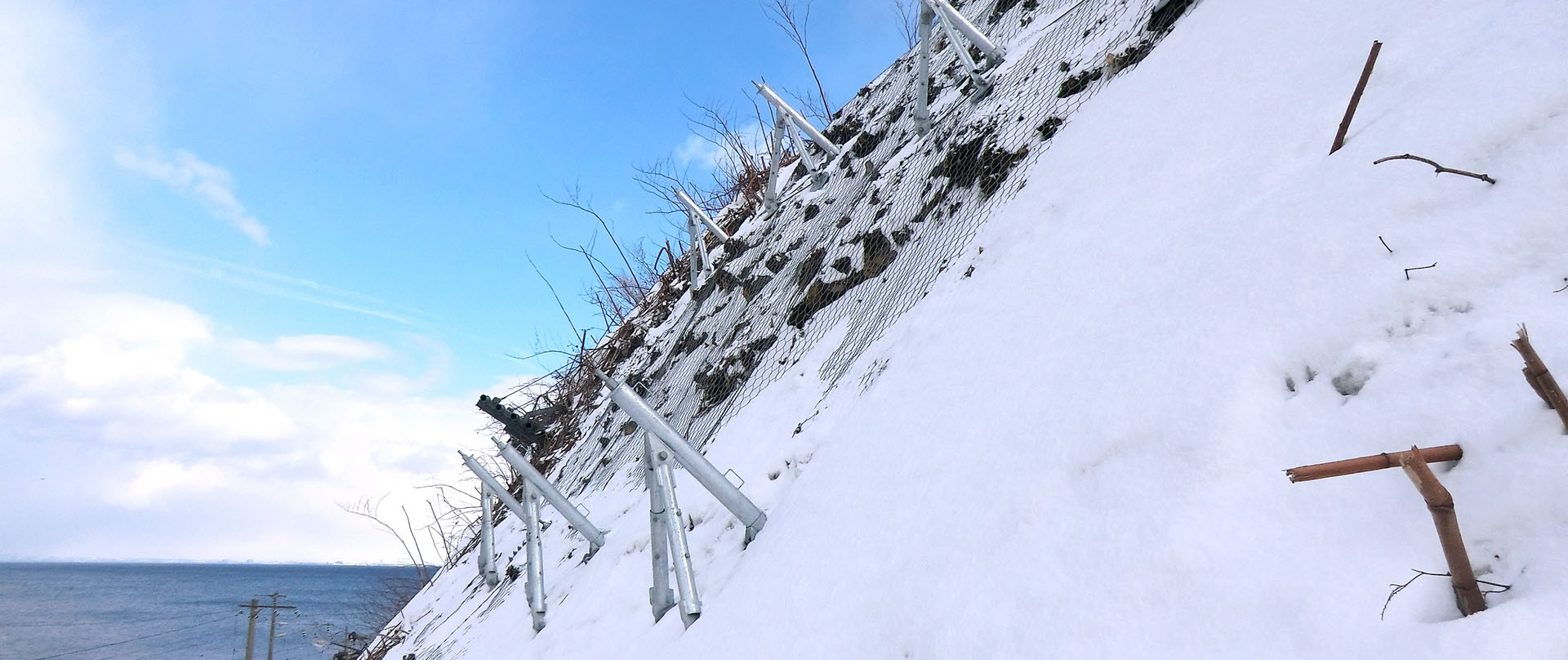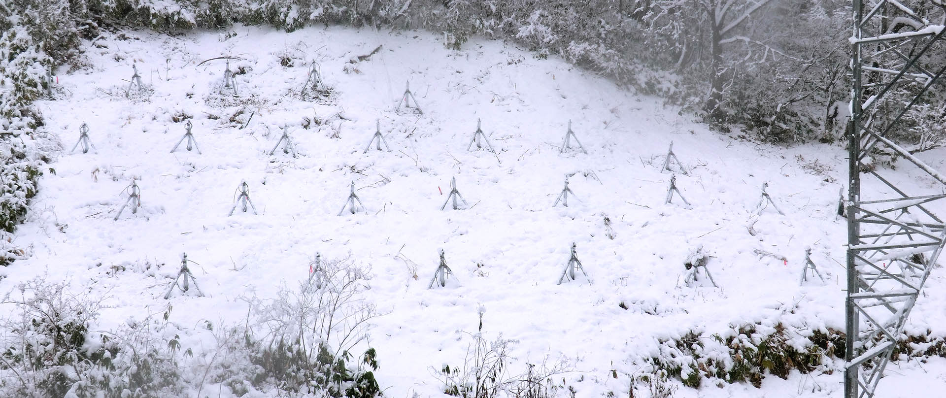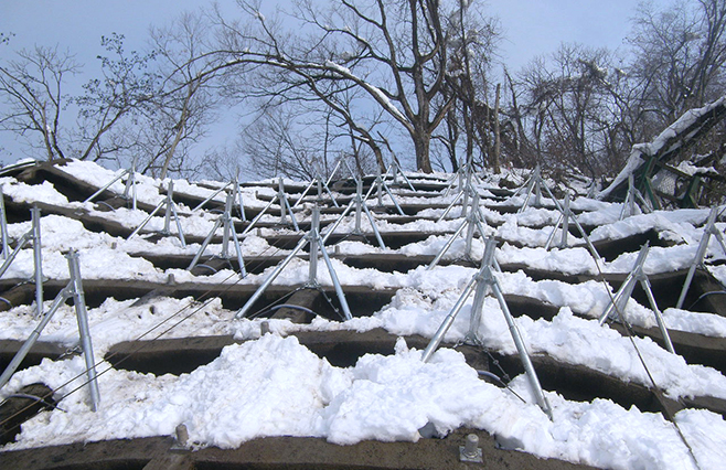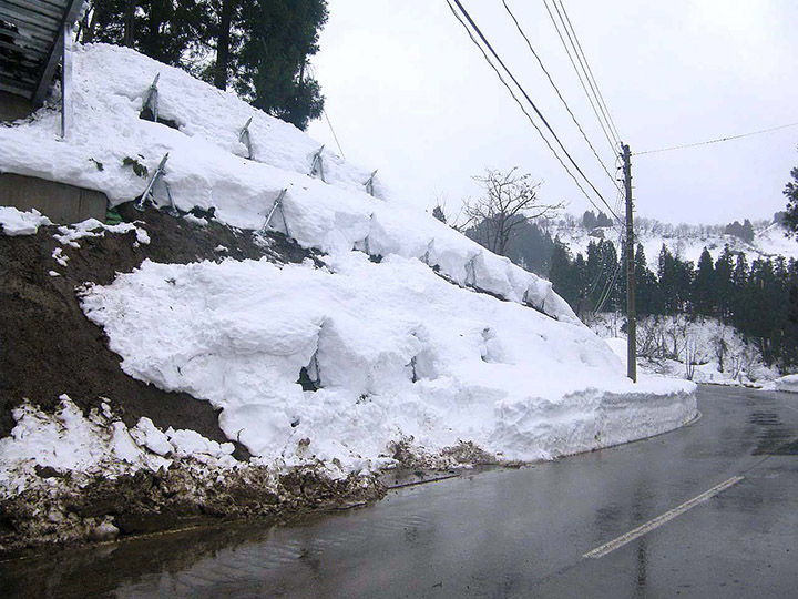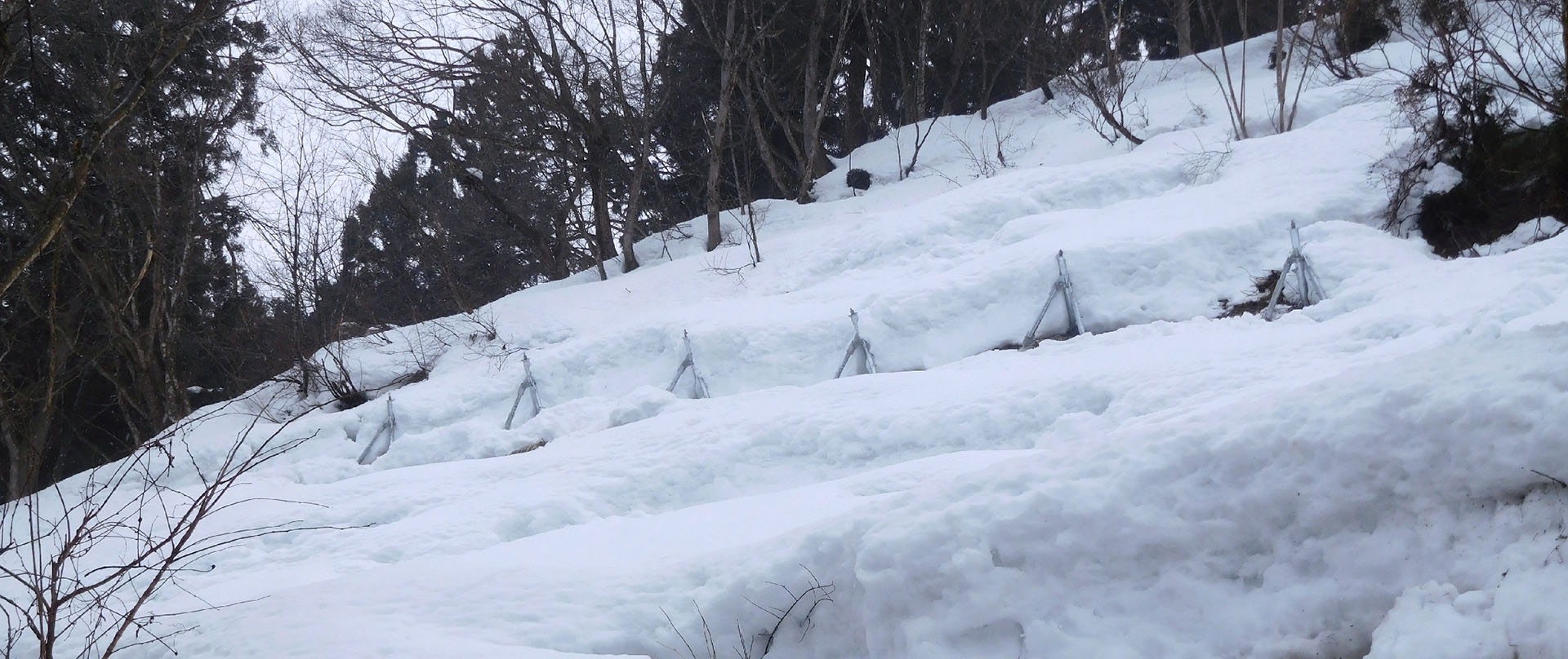 トライパイルを試験施工し、冬期間の観測を実施しました。2011年1月~4月、及び2012年1月~4月にはトライパイルに作用する斜面雪圧とアンカー引抜力の測定のため、小型データレコーダーを用いて3時間毎のデータ自動収集を行いました。測定期間中、斜面の積雪深の最大値は4.5m(2011年)となりましたが、トライパイル設置箇所では雪崩の発生はなく、トライパイルの雪崩予防効果を確認することができました。