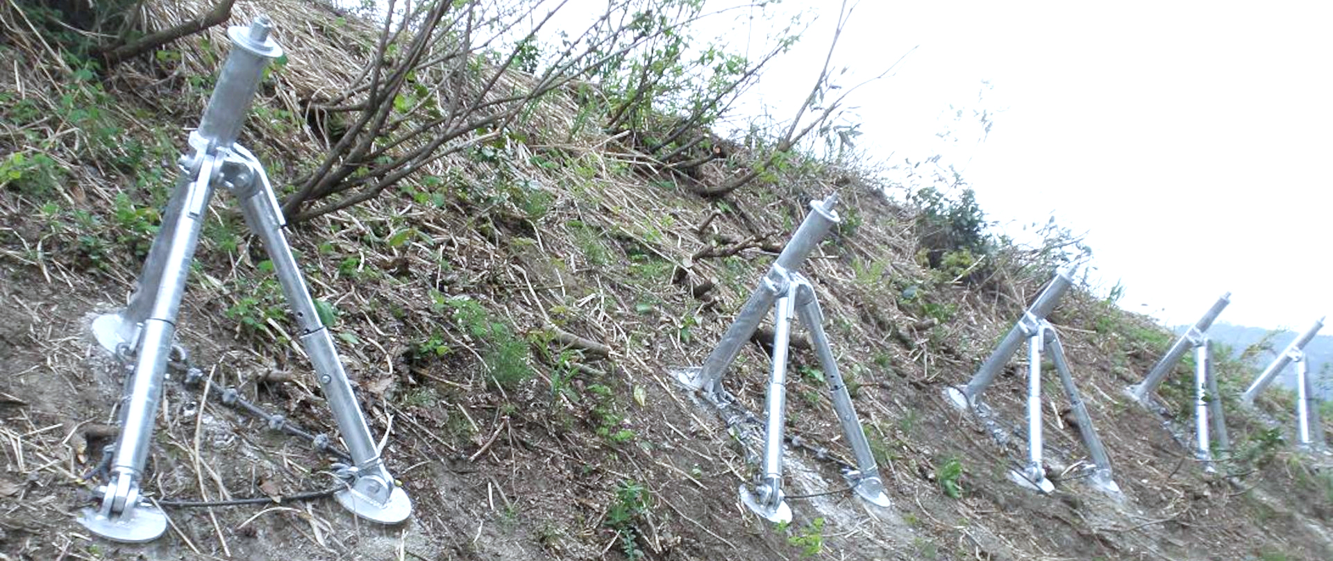 主柱を保持する支柱が伸縮自在なため、凹凸のある斜面や法枠斜面でも地形に合わせて容易に設置することができます。支柱の長さは現地で調整することで、不測な現場条件でも対応できます。
