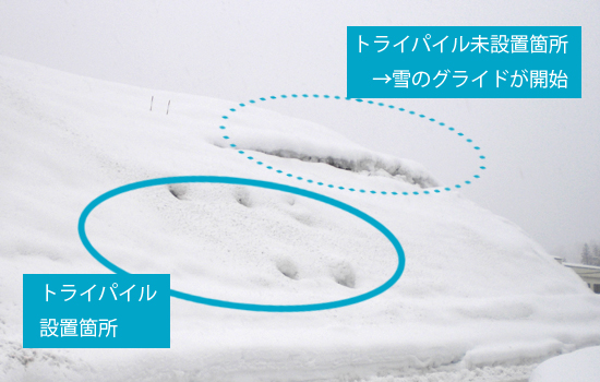 トライパイルは、斜面に設置して積雪のグライドを抑止する雪崩予防杭です。全層雪崩の発生防止に効果を発揮します。工期の限られた現場や、従来工法では仮設や材料運搬などが大掛かりになってしまう厳しい条件の現場で、施工性や経済性を発揮する工法です。