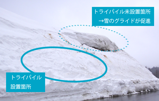 トライパイルは、地表部の主柱及び主柱を支える2本の支柱で構成され、地中部には自穿孔アンカーを設置して主柱を支持します。主柱によって雪のグライドを抑止します。
