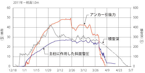 主柱に作用した斜面雪圧、アンカー引抜力、積雪深の経時変化