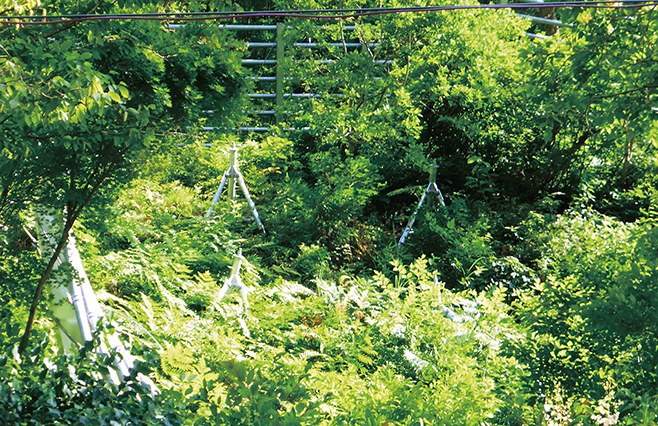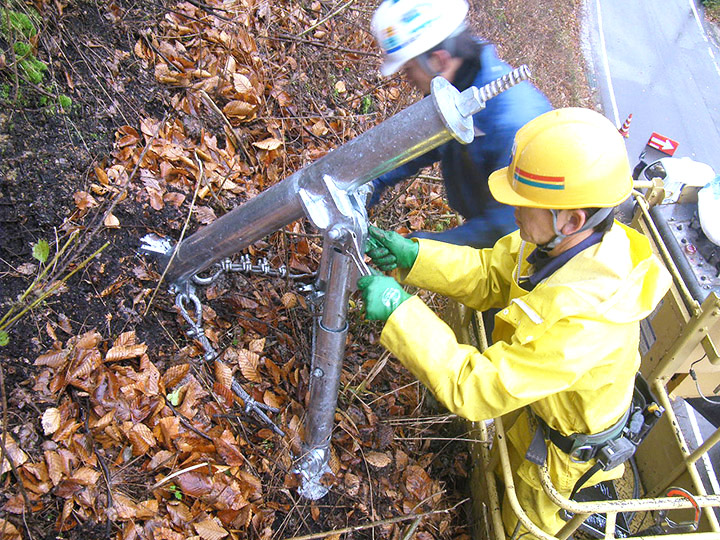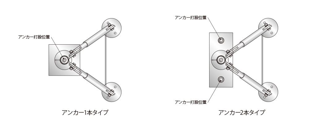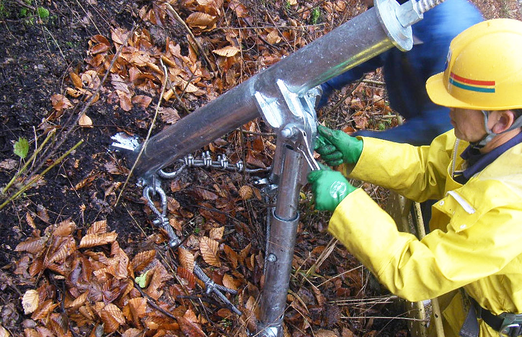 地形に合わせ、支柱の角度と長さを調整します。主柱と支柱の基部をワイヤロープで連結します。 -