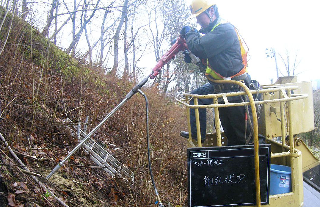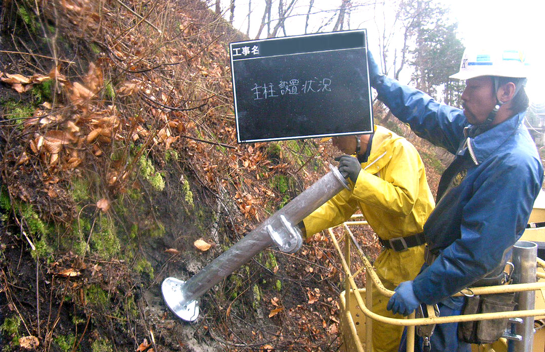 主柱設置位置に、削岩機を用いて所定の角度で削孔します。 -