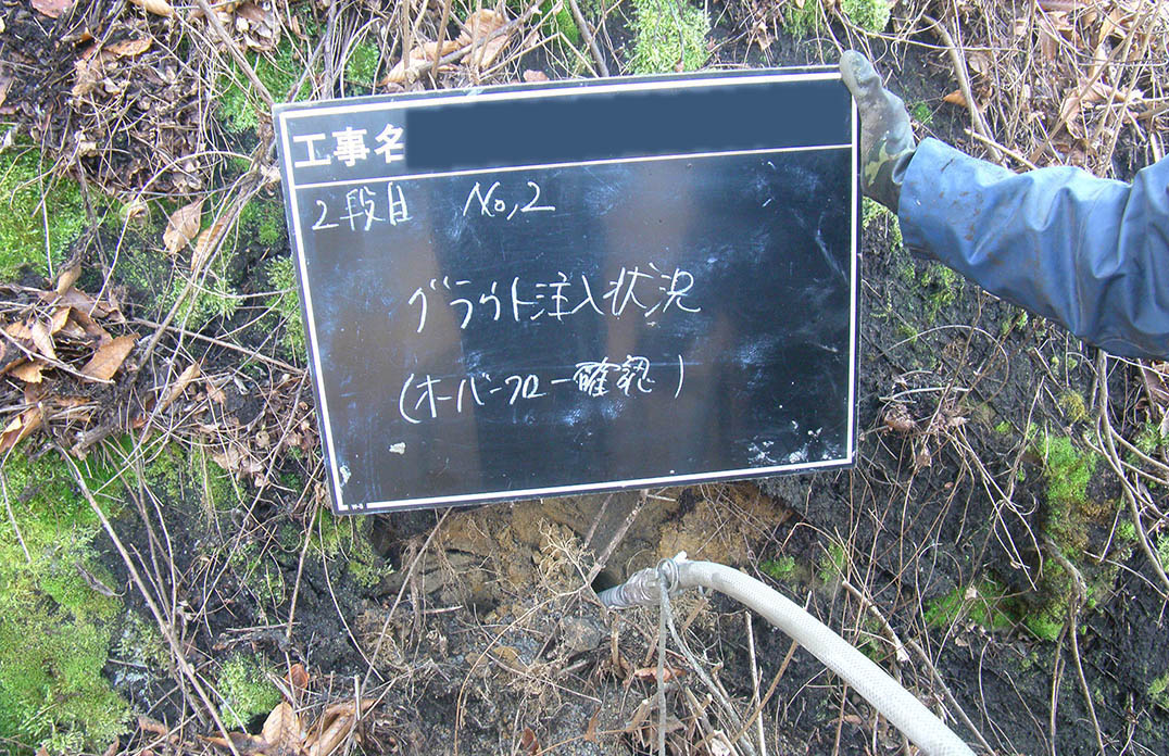 グラウトを所定の配合で練り混ぜ、孔内に注入します。グラウトの強度が設計値を満足するまで養生します。 -