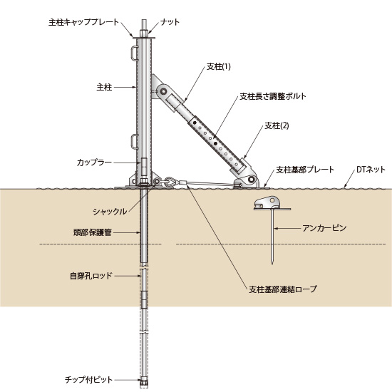 アンカー削孔角に合わせて主柱を建て込み、支柱を取り付けます。 -