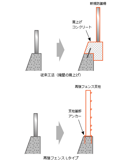 | 従来工法(擁壁の嵩上げ) | 再強フェンス Lタイプ | |