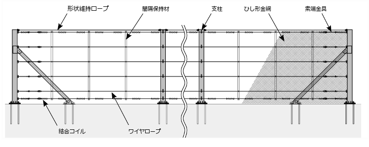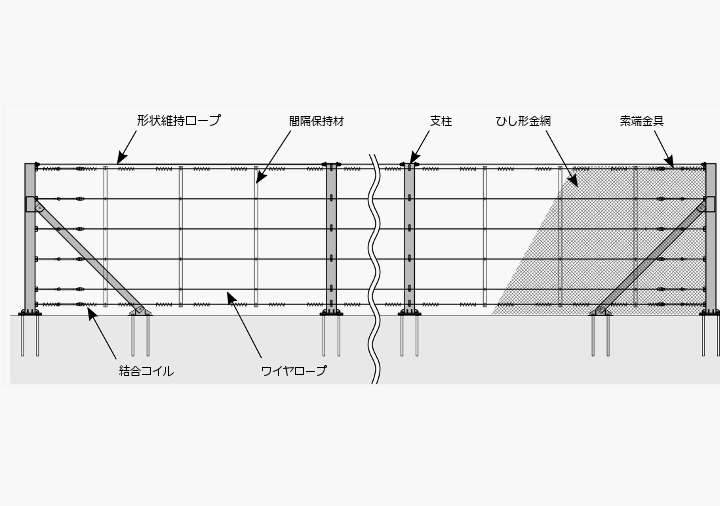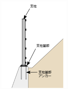 再強フェンス Lタイプは、支柱、ワイヤロープ、金網、支柱基部アンカーで構成されています。支柱の基部を既設の擁壁にアンカーで固定して、延長方向にワイヤロープと金網を張設します。