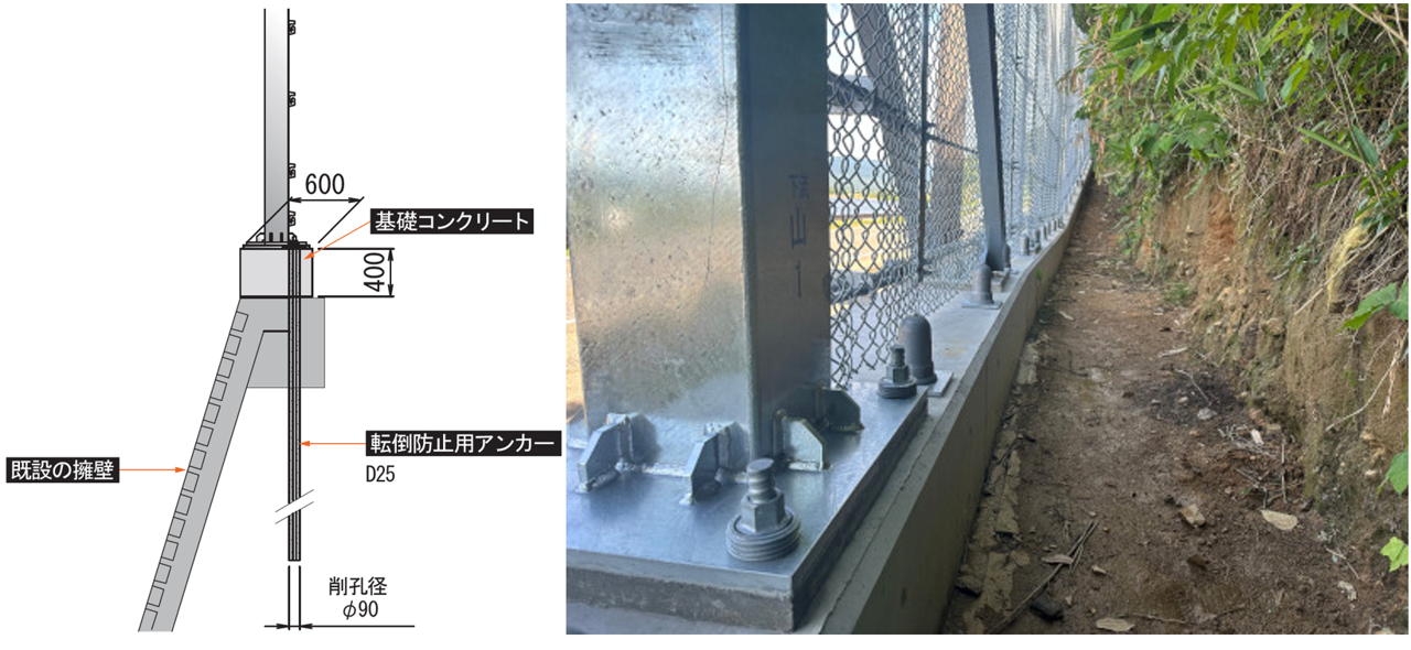 既設の擁壁が小さいとき、擁壁の増し打ちや擁壁自体の撤去・再設置が必要になることがありますが、このような場合、防護柵の転倒を防止するため、擁壁の天端部に「転倒防止用アンカー」を取り付けた「基礎コンクリート」を構築して、その上部に防護柵を設置することができます。